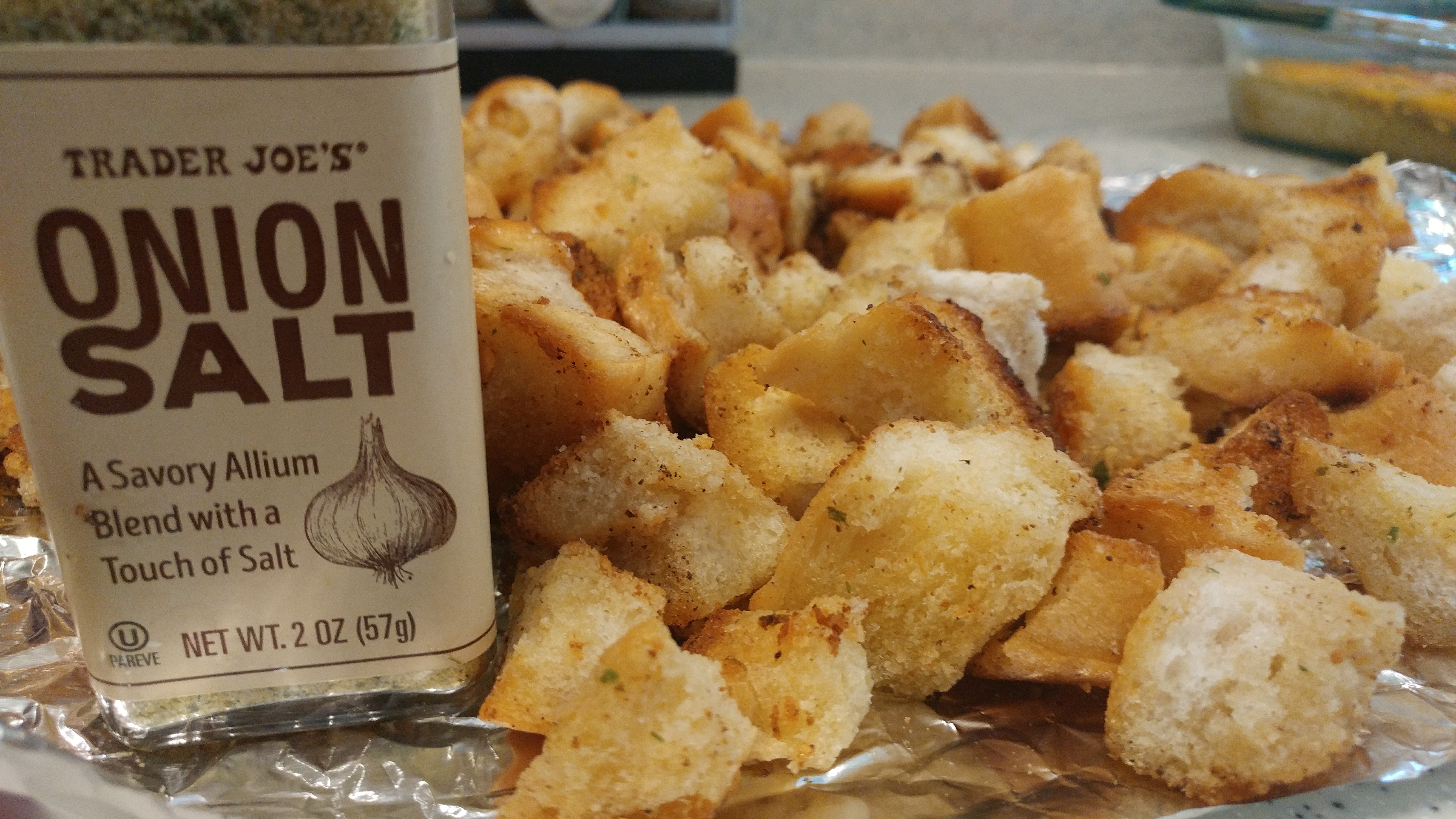 As a personal chef, I am always on the lookout for interesting seasoning blends, to elevate simple roasted vegetables, chicken or fish. One of my new favorites is Trader Joe’s Onion Salt. I had seen this, and passed it by, because I thought it was regular onion salt. I then realized that it is a really great blend of different onions, including chives and scallions. I have been using it on simple roasted potatoes, on baked salmon filets, on asparagus and roasted green beans. Recently I used it for croutons, which was a nice addition! Dried bread cubes, slowly cooked in butter and olive oil, with some smashed garlic cloves, and a liberal sprinkling of this onion salt. Delicious. This was for my regular clients in Chicago who are a family of four. She’s a busy mom always looking for time saving tips. Having a personal chef helps her keep it all together, with two cute active toddlers!