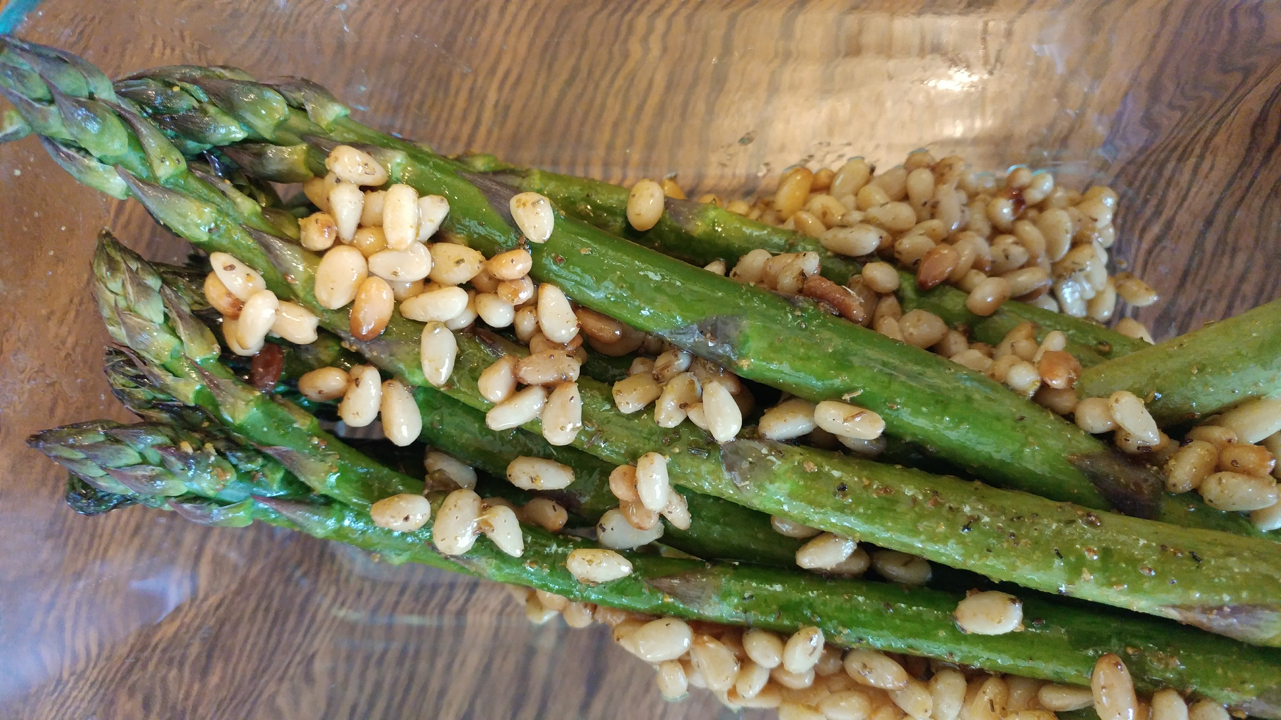 I have been blessed to cook for some wonderful retirees in Riverside for several years! They love American standard comfort food: Meatloaf, Mashed Potatoes, Apple Pie, etc! On this week’s menu for them, I made Oven BBQ Meatballs, Lasagna, Oven Fried Chicken, and Blueberry Cobbler (I have used this recipe a million times from Epicurious. It’s called “Bill’s Blueberry Cobbler” and it’s really great; probably due to the large amount of butter! It makes it so crispy around the edges!) I always try to make a few nice fresh vegetables for the Mrs. (the Mr. only likes one vegetable: canned green beans! Which I am more than happy to make him!) But for her, I make simple, but unusual vegetable sides like Asparagus with Fennel Pollen and Pine Nuts, Zucchini and Summer Squash with Brown Butter and Rosemary, Green Beans with Caramelized Shallots and Roasted Grape Tomatoes.